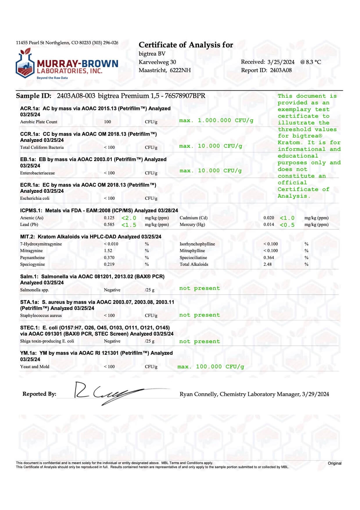 Conclusión: En Kratom.eu, nuestras pruebas abarcan todo el espectro — desde gérmenes microbiológicos hasta metales pesados. La supervisión del Murray Brown Laboratory, complementada por la amplia experiencia de bigtrea y nuestros procesos internos de calidad, te garantiza una experiencia de Kratom segura y pura. Si tienes alguna pregunta, nuestro servicio de atención al cliente está siempre a tu disposición.